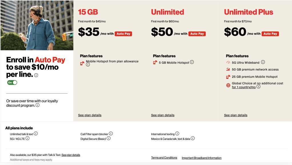 | Unlimited premium data on Verizon’s 5G Ultra Wideband network, their fastest 5G | Unlimited data, talk & text on Verizon’s 5G & 4G LTE networks | Unlimited premium data on Verizon’s 5G Ultra Wideband network, their fastest 5G |